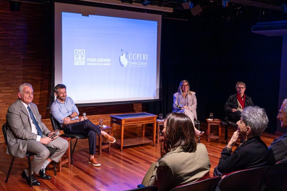 O desembargador Marcos Chut, do Tribunal de Justiça do Rio de Janeiro (TJRJ), e seu filho, o empresário Paulo Chut, foram os convidados da noite de quinta-feira, 14 de agosto, do programa literário “Do Direito à Literatura”, promovido pelo Centro Cultural do Poder Judiciário (CCPJ). No evento, os dois apresentaram o podcast “O Invisível Contador de História” e participaram da sessão de leitura e discussão pública do romance policial “O Peso da Flecha”, de autoria do desembargador, que conta o caso de um menor atingido por uma flecha na noite de réveillon.