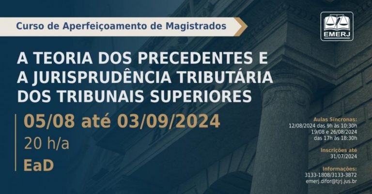 Com 40 vagas disponíveis, a Escola da Magistratura do Estado do Rio de Janeiro (Emerj) abriu inscrições para o curso de formação continuada “A teoria dos precedentes e a jurisprudência tributária dos Tribunais Superiores”, com início previsto para o dia 05 de agosto.