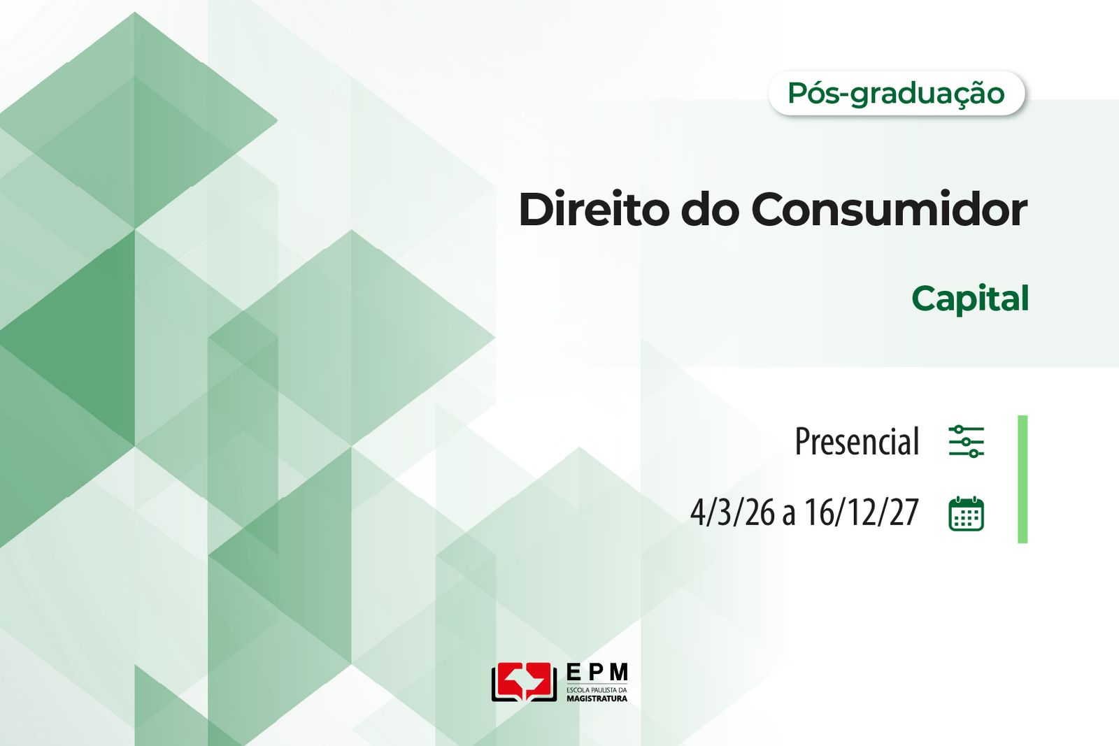 A Escola Paulista da Magistratura (EPM) realiza, de 4 de março de 2026 a 16 de dezembro de 2027, o 9º Curso de pós-graduação lato sensu, especialização em Direito do Consumidor, sob a coordenação do desembargador Alexandre David Malfatti e do juiz Guilherme Ferreira da Cruz. As atividades serão realizadas na Escola às quartas-feiras (seminários e aulas expositivas), das 7 às 13 horas.
