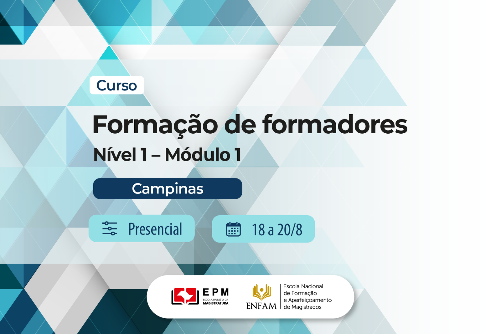 A Escola Paulista da Magistratura (EPM), em parceria com a Escola Nacional de Formação e Aperfeiçoamento de Magistrados (Enfam), promove o curso Formação de formadores – Nível – 1 Módulo 1, sob a coordenação do desembargador José Henrique Rodrigues Torres e do juiz José Eugenio do Amaral Souza Neto.