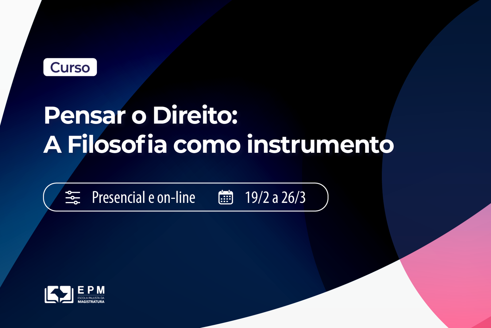 Estão abertas as inscrições para o curso Pensar o Direito: a Filosofia como instrumento, coordenado pelo desembargador Paulo Magalhães da Costa Coelho e pelo juiz Jarbas Luiz dos Santos. As aulas acontecem entre os dias 19 de fevereiro e 26 de março, das 19 horas às 21h30, no auditório do 1º andar da EPM e pelo Teams.