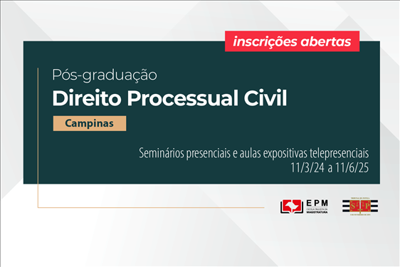 A Escola Paulista da Magistratura (EPM) está com inscrições abertas para o Curso de pós-graduação lato sensu, especialização em Direito Processual Civil, que será promovido de 11 de março de 2024 a 11 de junho de 2025 no Núcleo Regional de Campinas, sob a coordenação do desembargador Milton Paulo de Carvalho Filho, coordenação adjunta do juiz Airton Pinheiro de Castro e coordenação local do juiz Luiz Antônio Alves Torrano.