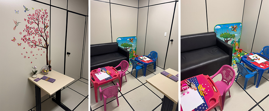 As mulheres que forem realizar pedidos de medidas protetivas também são acolhidas. Com essa sala, elas ficam separadas dos agressores e recebem atendimento, dispondo também de brinquedos para aquelas que comparecem acompanhadas dos filhos.
