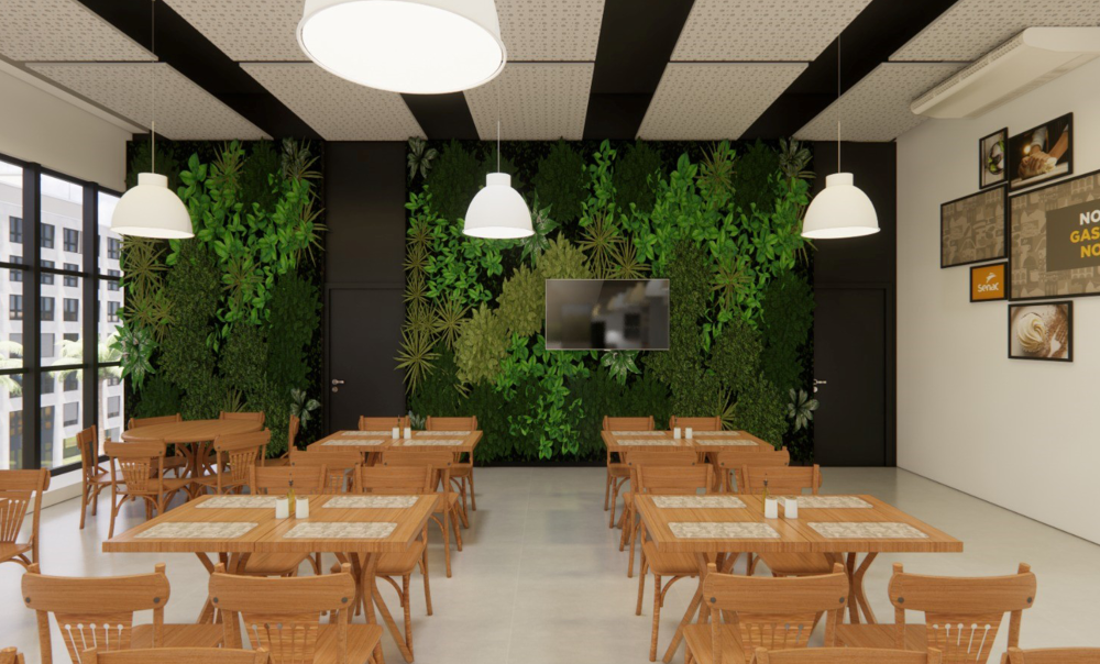 Para tornar o espaço mais acolhedor o restaurante foi totalmente repaginado. Uma nova paleta de cores com tons neutros e amadeirados criaram uma atmosfera moderna e sofisticada. Para proporcionar mais conforto aos usuários, foi instalado um forro acústico com placas perfuradas. Também foram adquiridos novos equipamentos de climatização para garantir uma temperatura agradável, além de uma nova iluminação planejada através de pendentes e perfis de led.