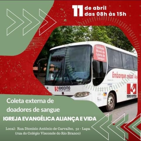 A Igreja Evangélica Aliança e Vida estará com a unidade móvel do Hemocentro captando doadores de sangue, na próxima terça-feira (11), de 8h às 15h, na Rua Dionísio Antônio de Carvalho Nº 52 no bairro da Lapa (Próximo a Escola Estadual Visconde do Rio Branco). Não deixe de participar, pois sua doação salva até quatro vidas. (leia mais abaixo)